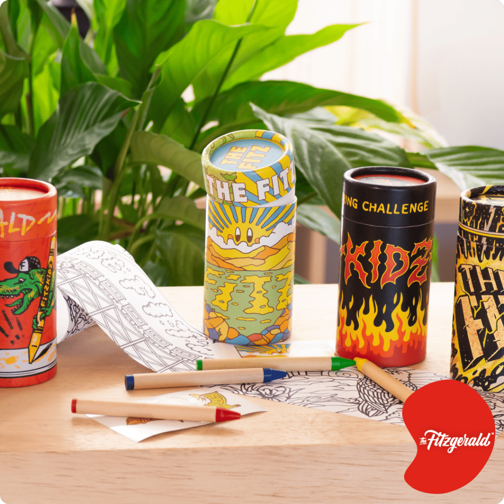 The Fitzgerald es una cadena de hamburgueserías gourmet que destaca por su estilo moderno. Para una de sus campañas, creamos un Coloring Tube con diferentes diseños inspirados en su universo gráfico.